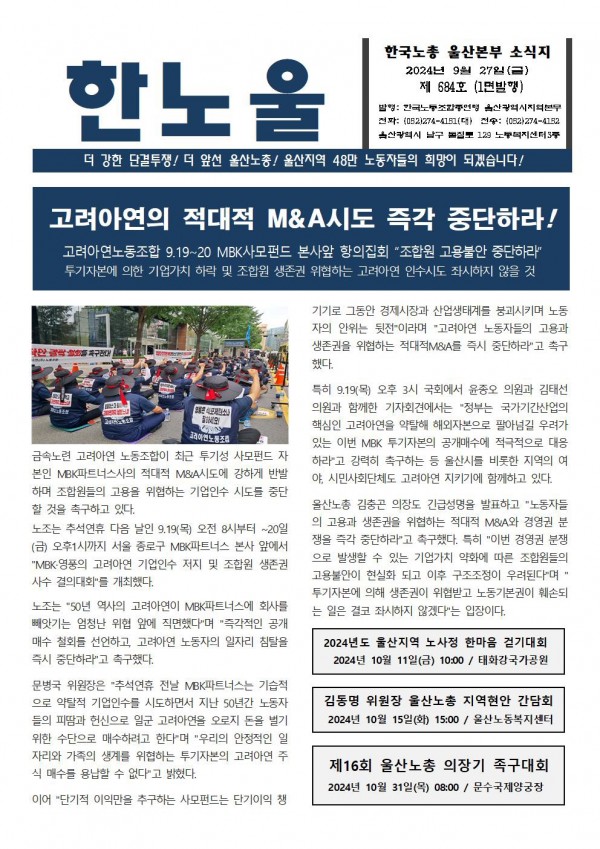 Çѳë¿ï 684È£ °í·Á¾Æ¿¬ÀÇ Àû´ëÀû M&A½Ãµµ Áï°¢ Áß´ÜÇ϶ó!